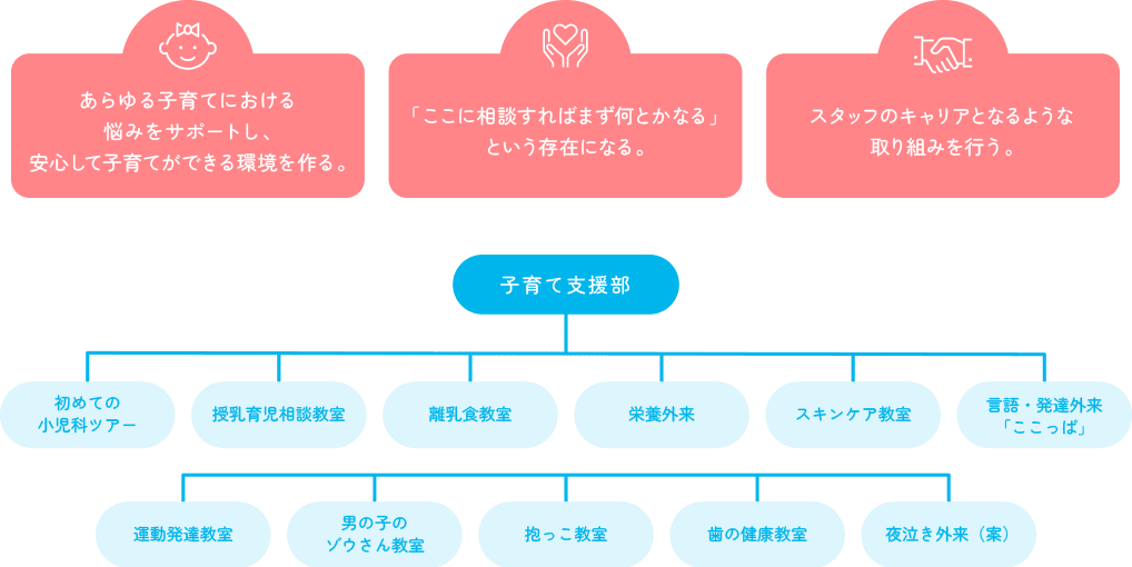 授乳・離乳食・睡眠・スキンケアなど、育児にまつわるお悩みに応える相談外来や各種教室を定期的に開催しています。運営は「子育て支援部」が中心となり、必要に応じてスタッフ自身が資料を作成したり、知識を深めるために勉強会を企画したりと、主体的に取り組む文化が根付いています。