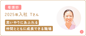 私は人見知りな性格で、新しい環境に慣れるのが得意ではないのですが、メンターの方が他のスタッフとの会話の機会をつくってくださり、スムーズに職場に溶け込むことができました。今では、入職を決めて本当によかったと心から感じています。日々の気遣いや優しさに、感謝の気持ちでいっぱいです。 -